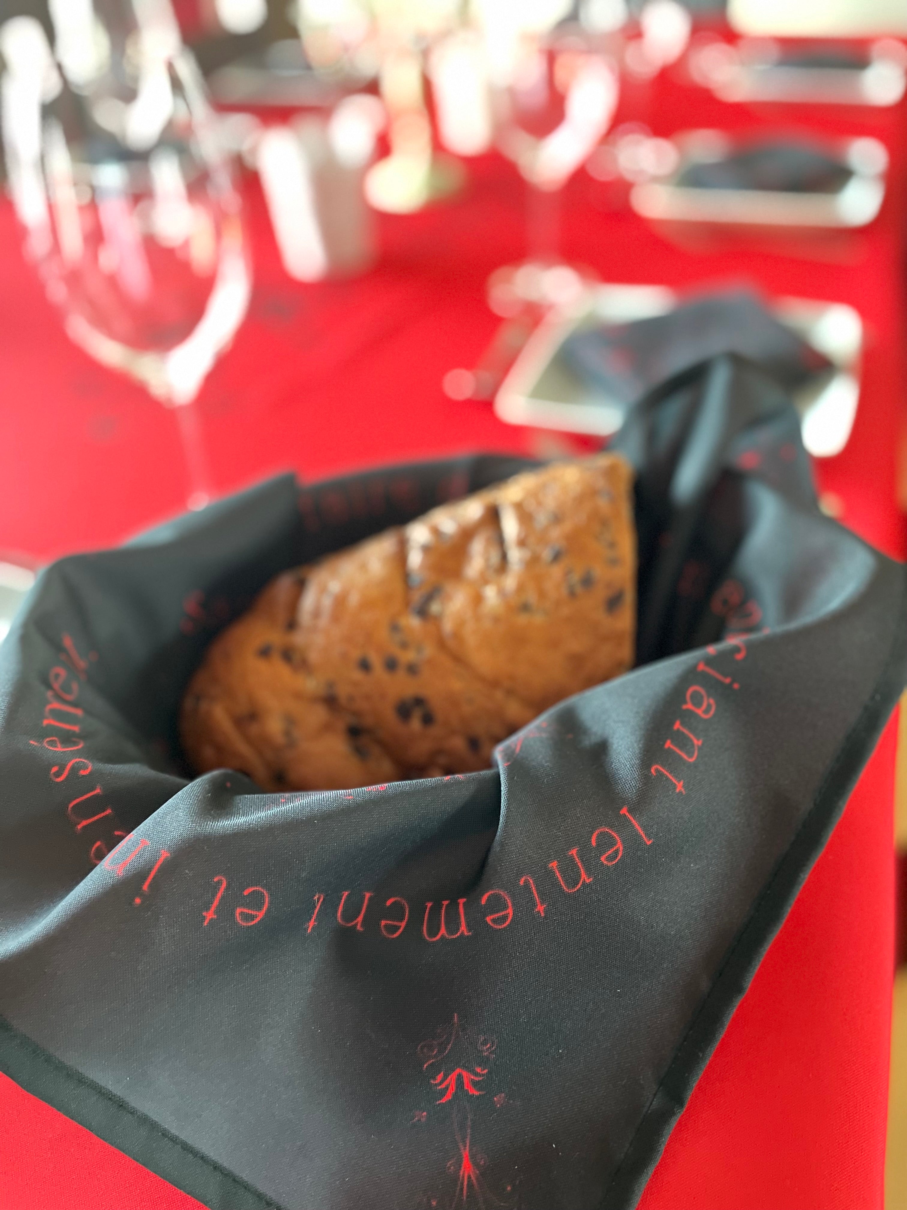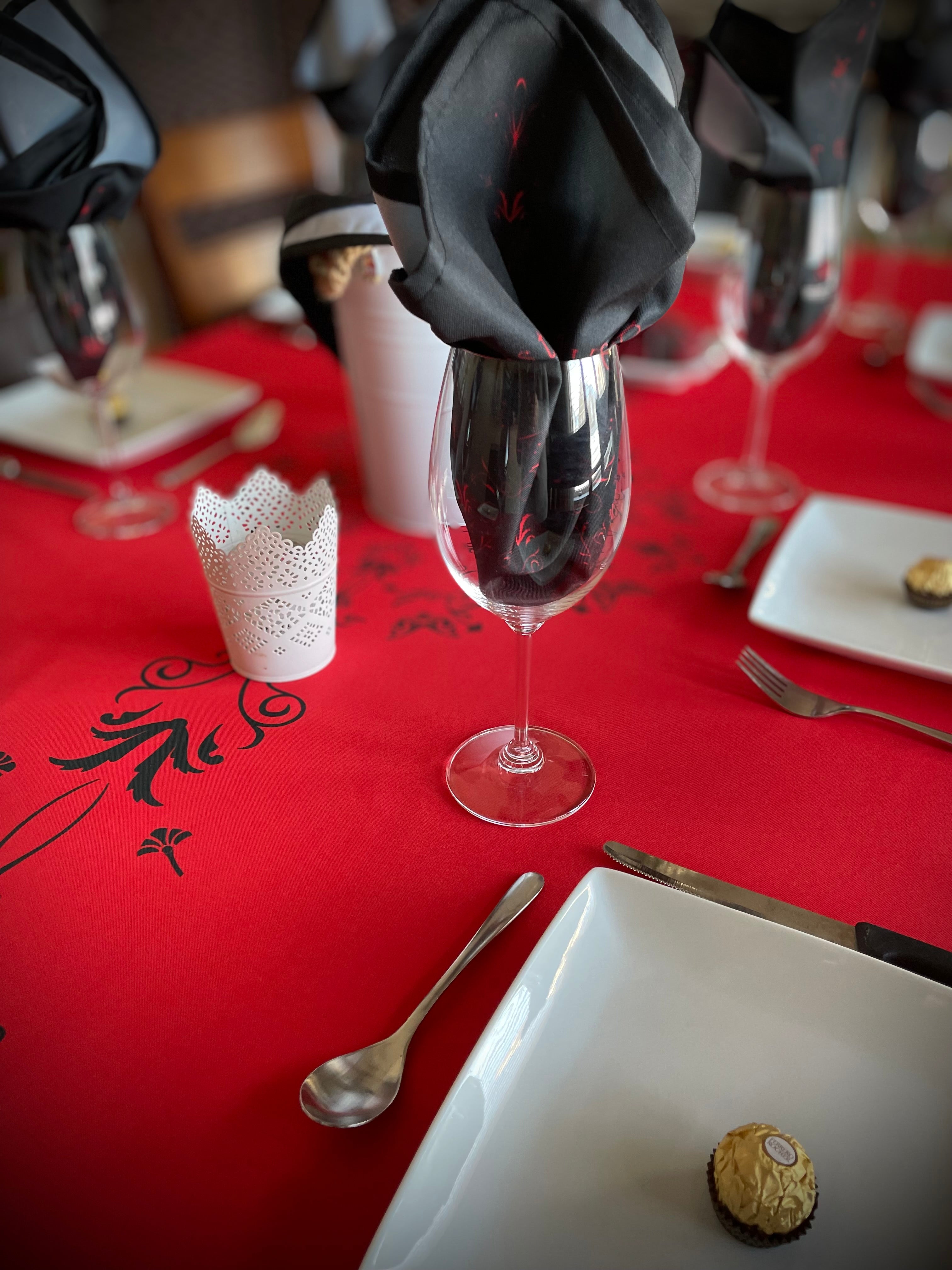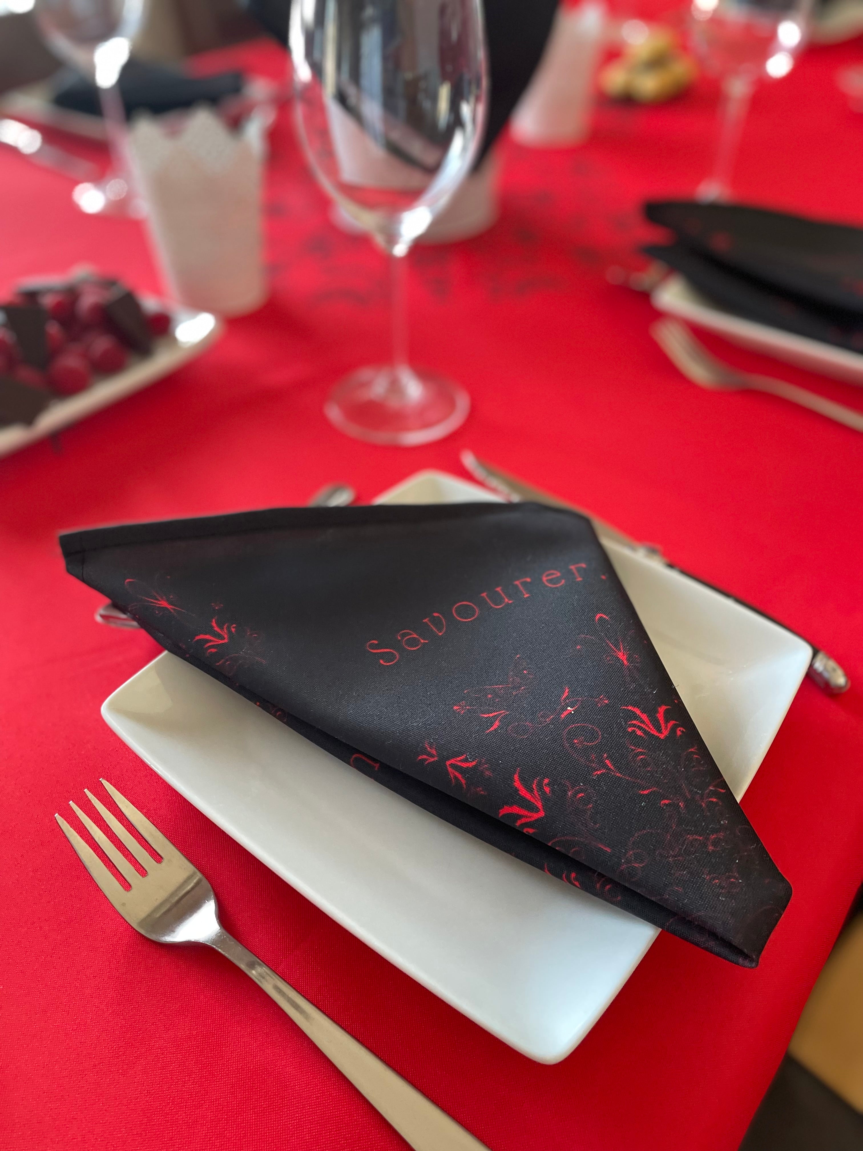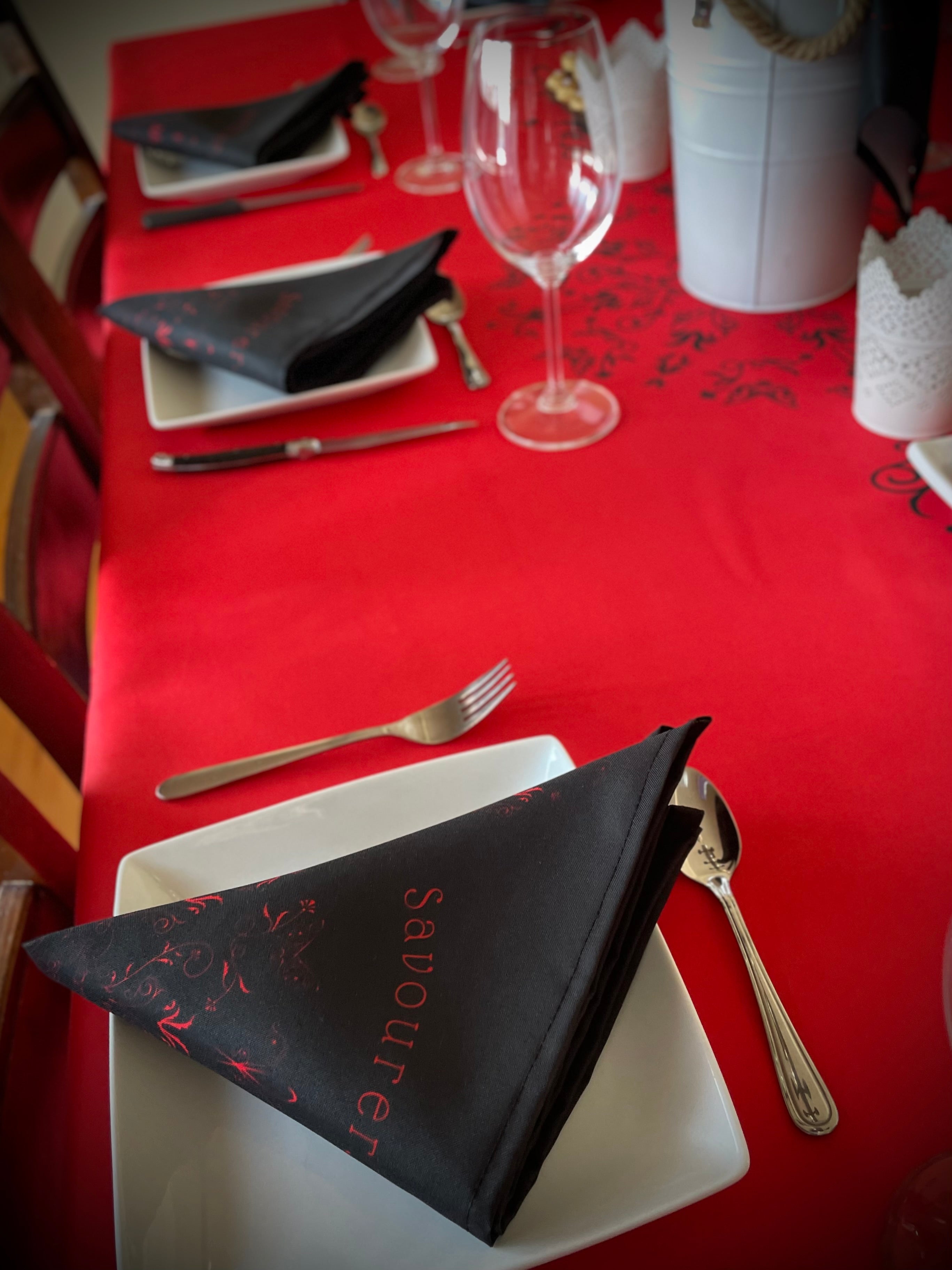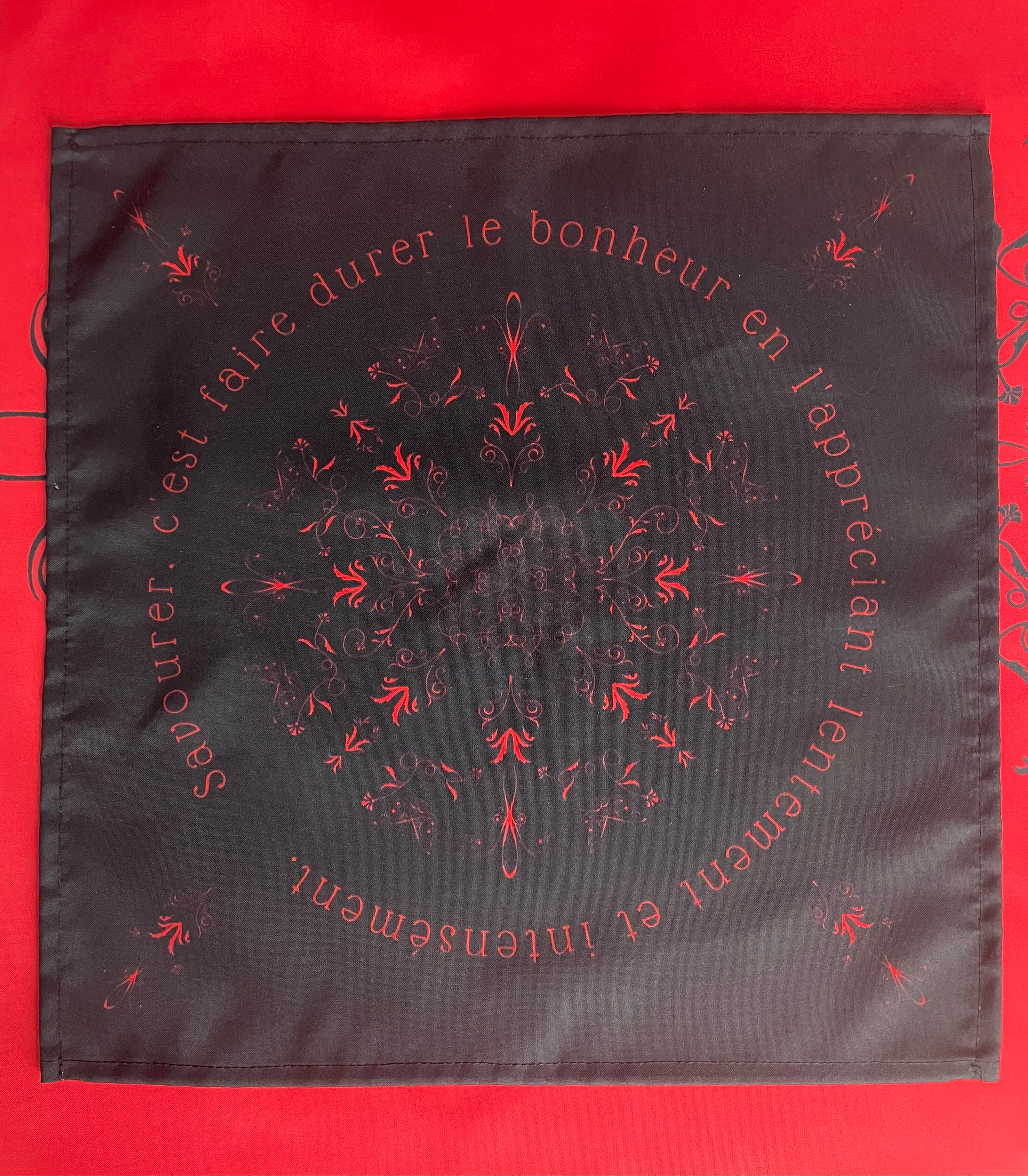 This set of 4 napkins matches the tablecloth from the Savourer collection by Maison Mixy. The black color adds drama to the vibe of this collection with its medieval banquet style pattern.